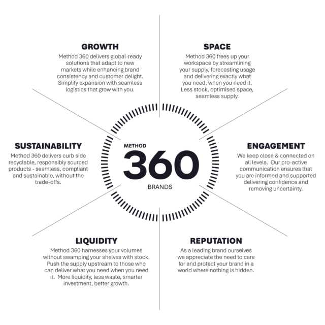 Method 360 harnesses your volumes without swamping your shelves with stock. Push the supply upstream to those who can deliver what you need when you need it. More liquidity, less waste, smarter investment, better growth.